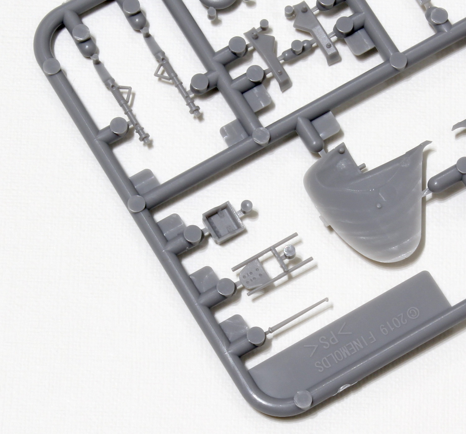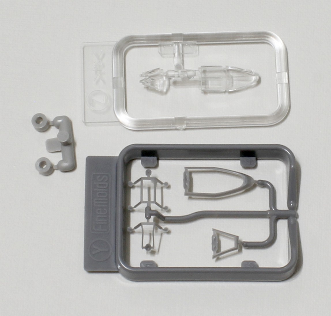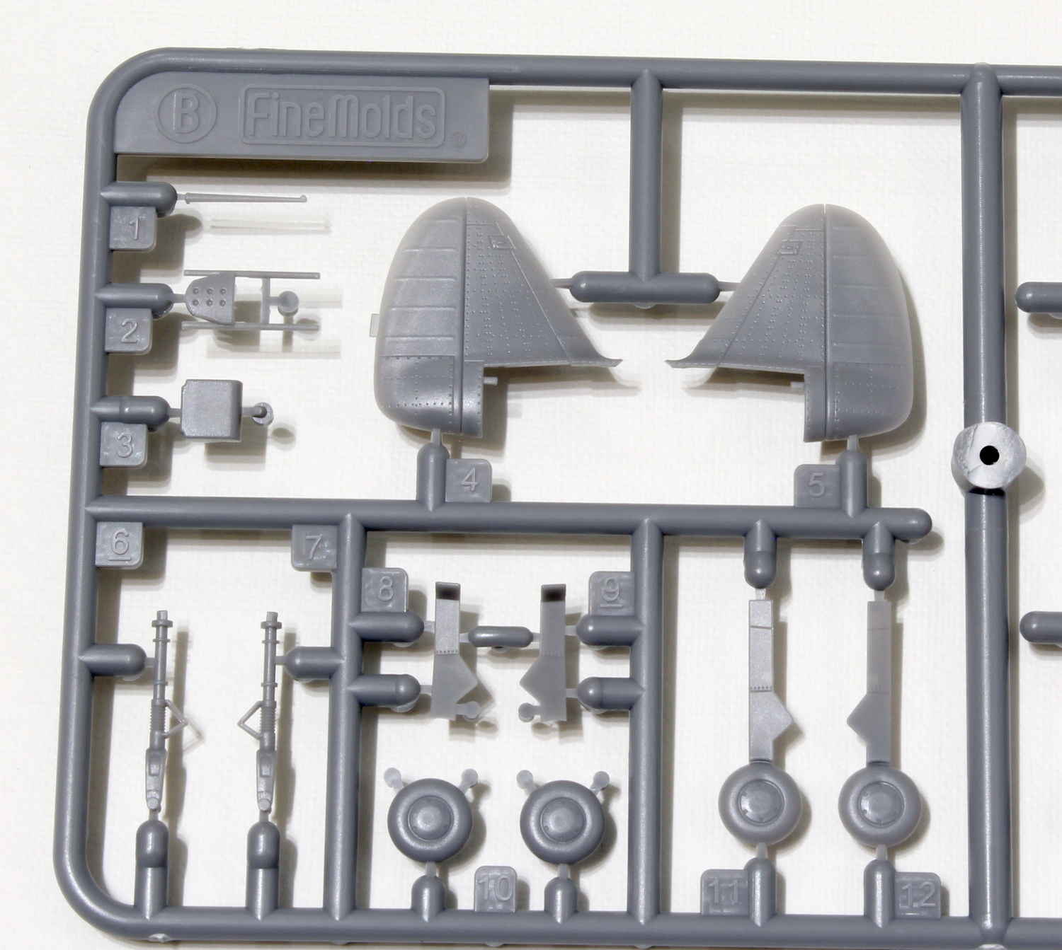 In addition to the main parts located in conventional sprues, there are 2, respectively 3 parts included separately - the cowling, upper central fuselage part, and finally, hollow fuselage part (rear part behind the canopy to the tail planes) injected in one piece. I’ve seen this engineering only in 1/32 scale, yet since it is tricky and demanding to avoid offset (it includes the moving slider in the mould, in this case directly in the parting line) and last but not least, it is expensive. Fine Molds mastered this solution excellently; the fuselage does not have an offset in parting line (only small common flash, aprox.0.1 mm) and when I dry fitted the parts, not cleaning the intakes completely, the parts even holds on their places without a glue or tape. Separate upper central fuselage part and engine cowling could indicate that other versions of Hayabusa will follow in future (my speculation).